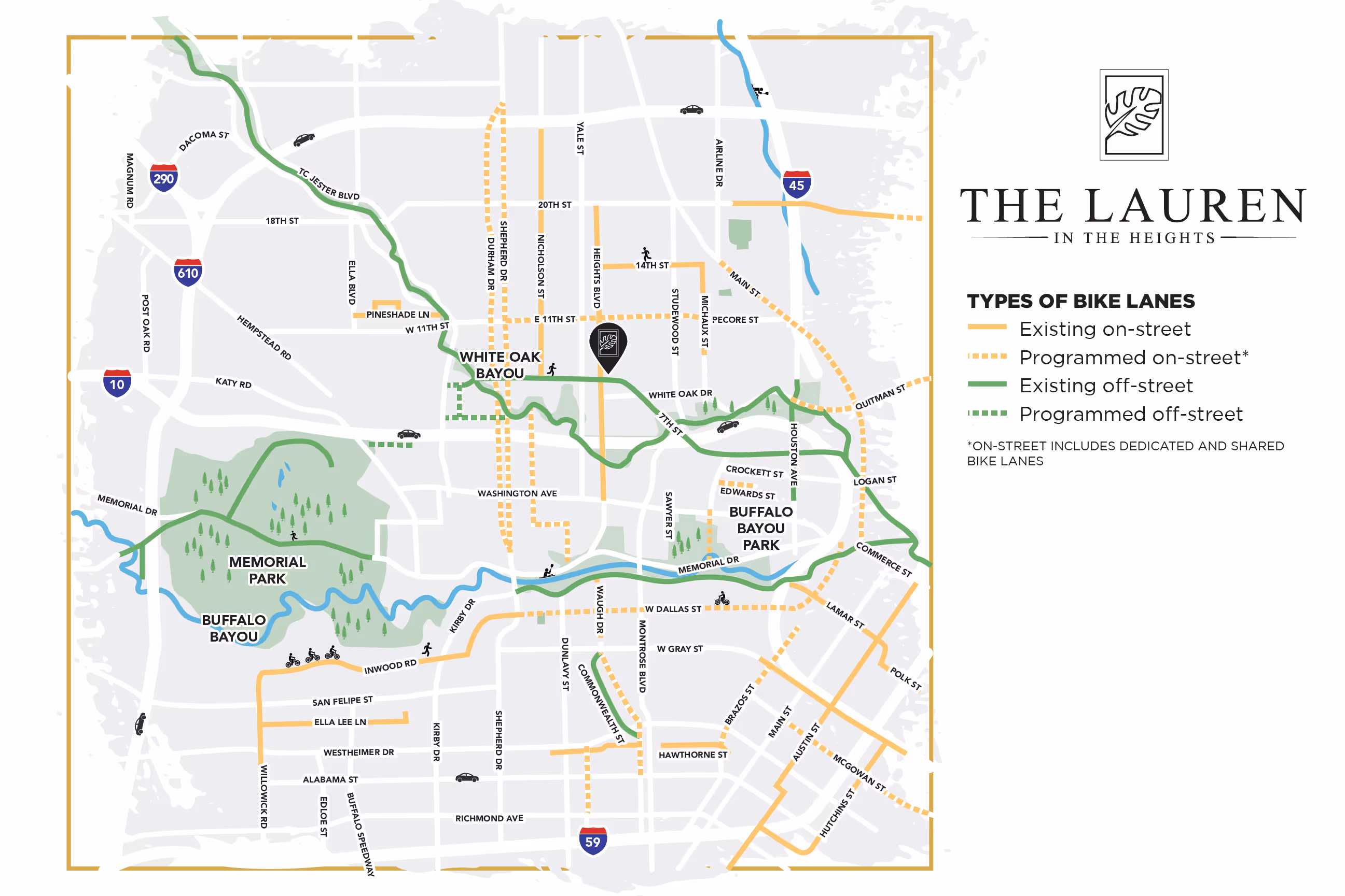 Located in the middle of The Heights, The Lauren is steps away from Donovan Park, Houston Heights Bike Trail, and Anytime Fitness! If you prefer to shop, head down to Heights Plaza Shopping Center, Heights Common Market, or Lululemon! Not to mention being surrounded by Houston’s numerous, authentic restaurants and great food, The Lauren in The Heights is without a doubt the best location in The Heights!